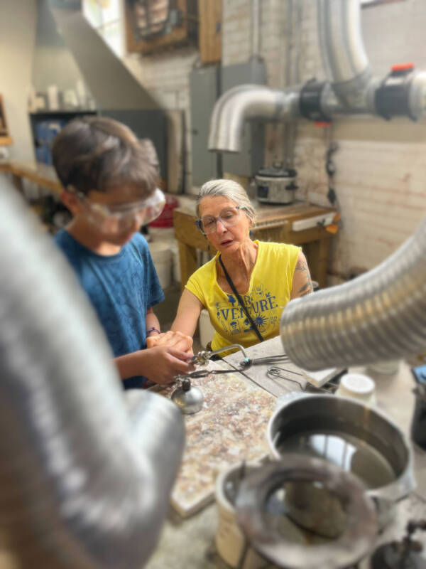Dispersed at their own workbenches around the studio, each of the 12- to 14-year-old campers are fully focused on their nature-inspired metal creations. They’re doing potentially dangerous things—with ignited torches and pointy pliers—with great care and safety under the expert guidance of Jeannine Metzfield.