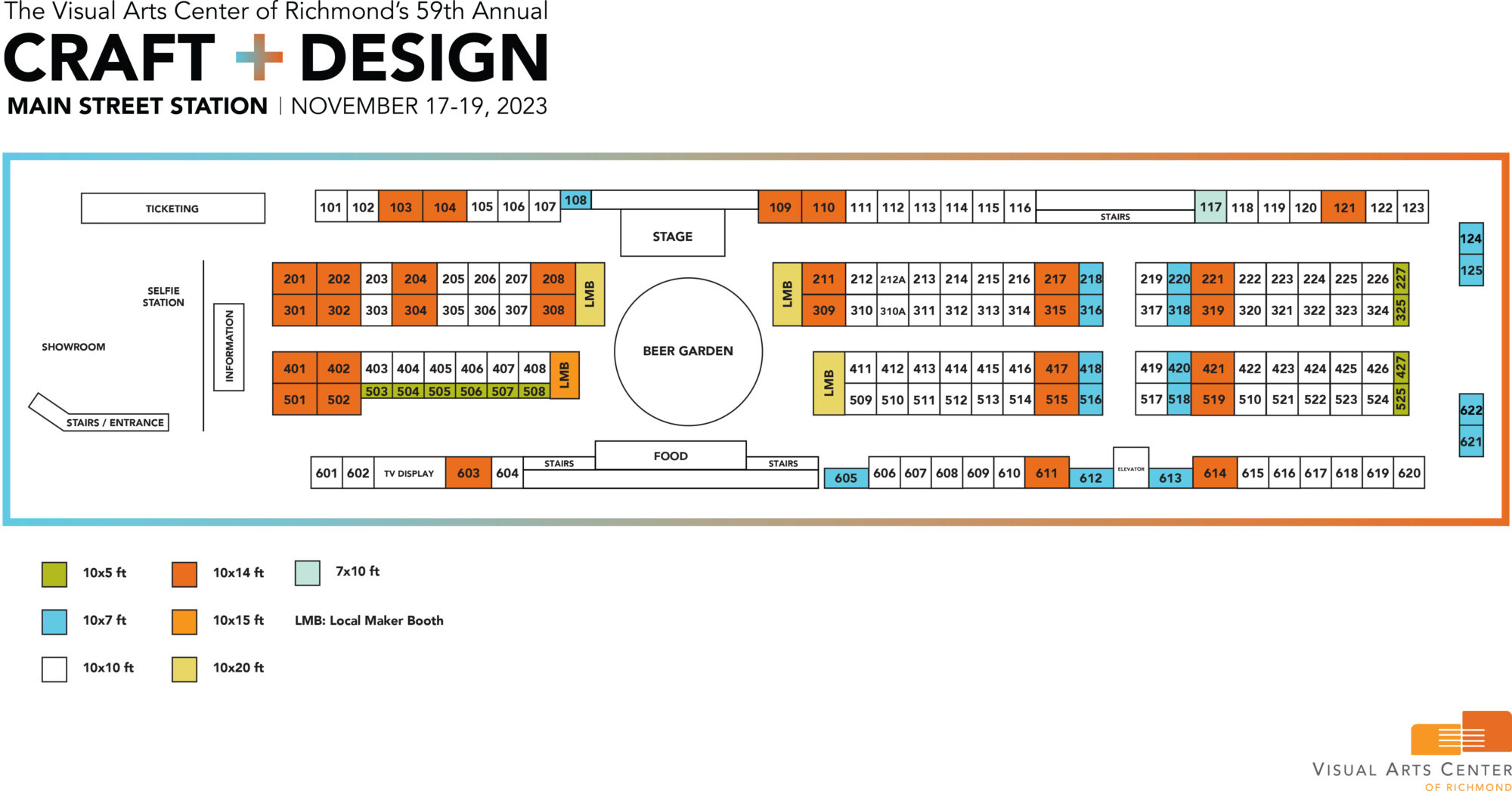 Please reference this floorplan, if necessary, when making booth requests. There will be 7′ x 10′, 10′ x 10′ and 14′ x 10′ booths available. If you complete your booth deposit online, please still remember to email your artist contract to the special events manager Adam Dorland at [email protected].